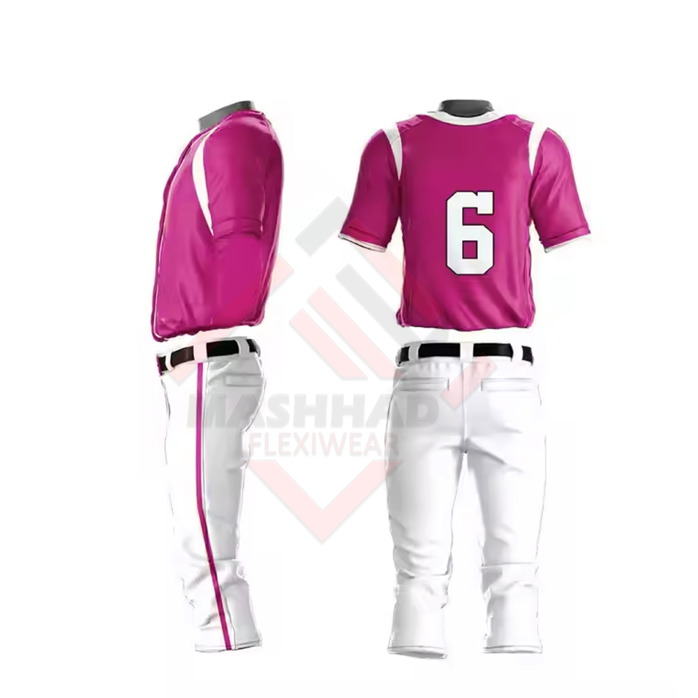 A baseball uniform includes a button-up jersey with the team name or logo on the front and the player's number on the back, often made from durable, breathable fabric. It is paired with matching pants that may be worn long or tucked into high socks, along with a belt for a secure fit. The full uniform is completed with a cap, cleats for traction, and optional accessories like batting gloves or arm sleeves.