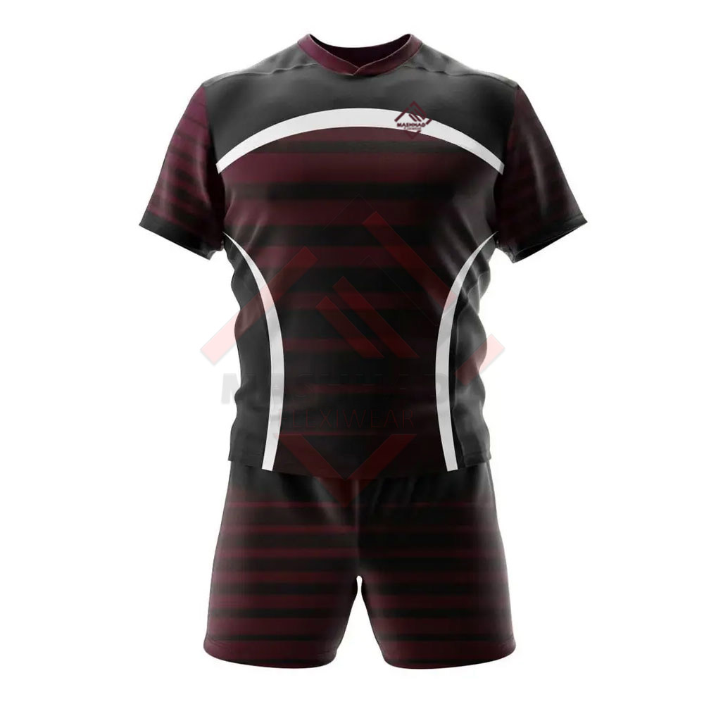 A rugby uniform consists of a durable, tight-fitting jersey made to withstand tackles, featuring the team’s colors, logo, and player number on the back. It is paired with tough, flexible shorts that allow freedom of movement and are built to endure physical play. Players wear long socks, cleats for grip on the field, and optional gear like mouthguards and scrum caps for protection.